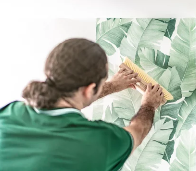 Positionner le lé numéro 1 sur le long du repère tracé préalablement en veillant à laisser un débord de 2 cm sur la partie supérieure de votre mur ainsi que sur le bord gauche. À l'aide d'une palette à maroufler ou d'une brosse, lisser soigneusement la première bande de l'intérieur vers l'extérieur afin de chasser les bulles d’air.