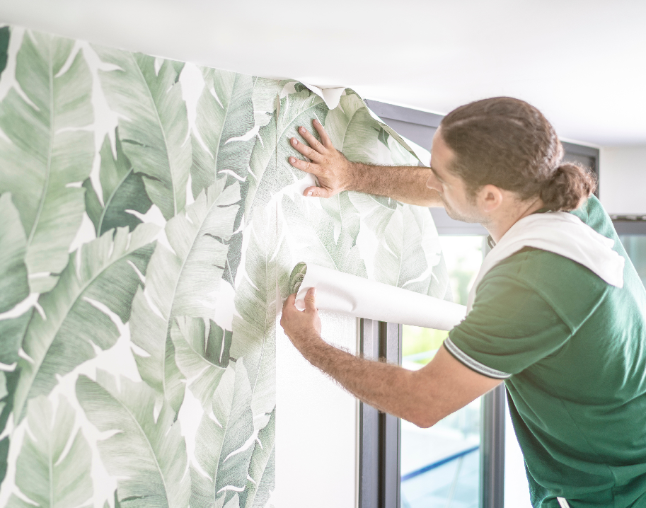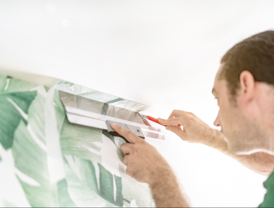 Une fois la colle totalement sèche, à l’aide du cutter et d’une règle, couper le surplus de papier peint le long des plinthes, du plafond et des bords.